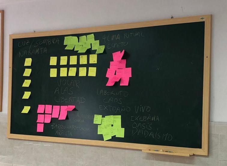 Aquí se activaba la parte creativa y emocional de cada uno de los y las participantes. Cada uno tuvo que escribir en un post it una palabra que definiera aquello que le sugiriera esa foto, y pegarlo en la pizarra. Se fue creando un mapa de palabras, que leímos en voz alta. Luego escogimos aquellas que al grupo les parecieron más interesantes, más sugerentes y, poco a poco, como si se filtraran a través de un embudo, se fueron quedando las que más consenso generaron: Nido. Vuelo. Amate. Jardines.