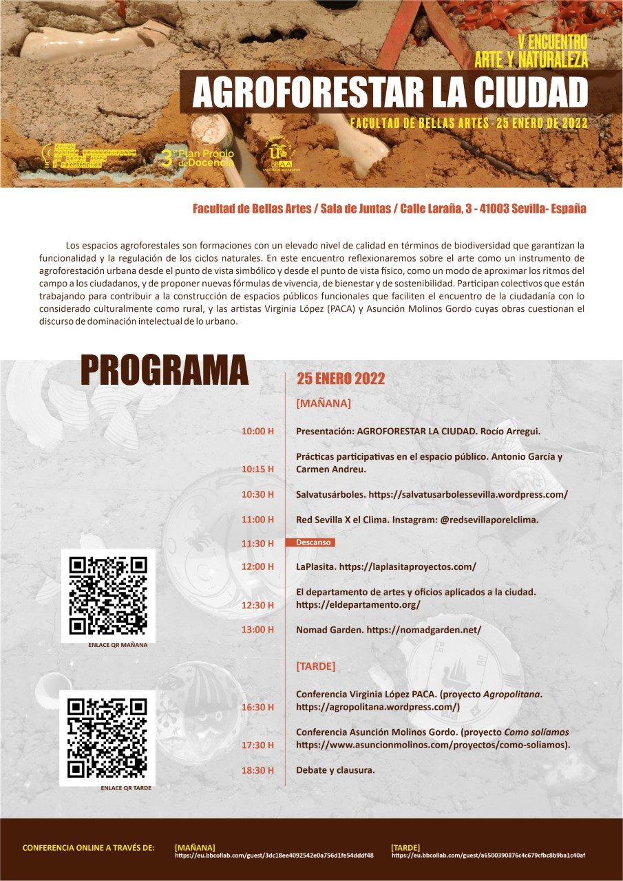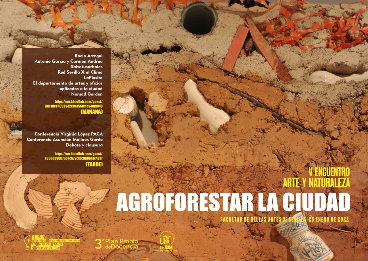 Dentro de las actividades del Máster Universitario en Arte: Idea y Producción, se celebra el V Encuentro de Arte y Naturaleza, que tendrá como eje temático: Agroforestar la ciudad, el día 25 de enero en la Sala de Juntas de la Facultad de Bellas Artes de Sevilla.