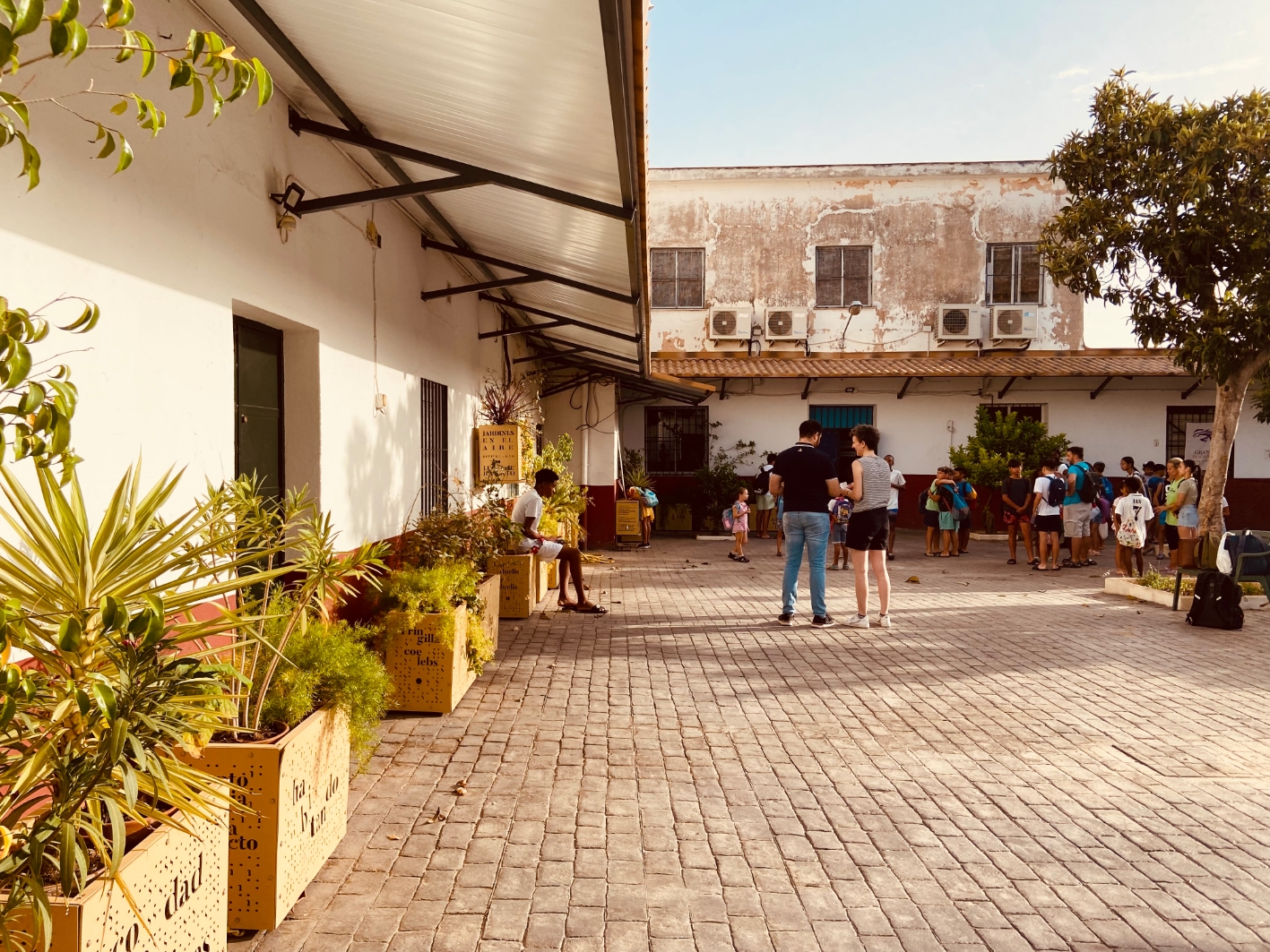 Months later, after years of observations, measurements, care and learning, it was time to remove the vertical garden from the façade. In agreement with the association, it was decided to place the planters in the courtyard while we thought about how to continue the project. This decision was an opportunity to bring the garden closer to the children of AES Candelaria and to make them take responsibility for watering it, always reusing the water collected from five air conditioning machines.