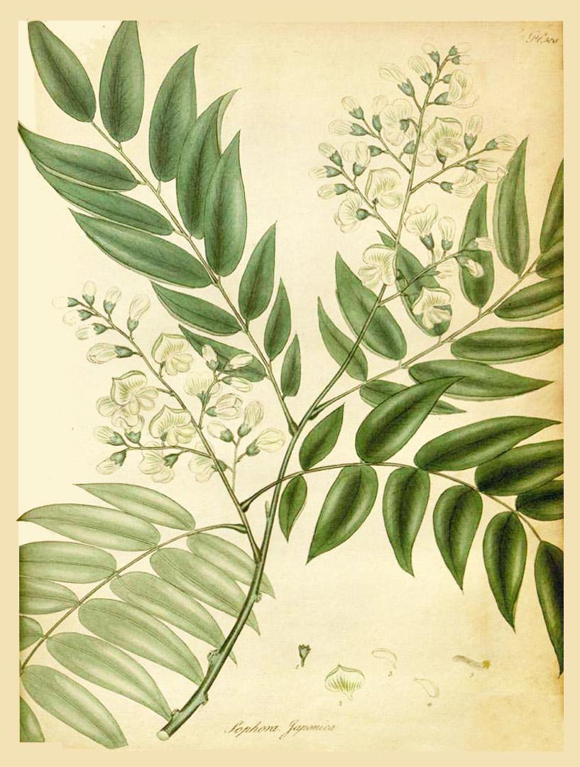 FabaceaeA pesar de que el epíteto específico japonicum hace referencia a una procedencia japonesa, es una especie nativa de China, si bien desde muy antiguo introducida y muy cultivada en Japón. Hasta la Revolución maoísta -tras la cual se plantó un nuevo ejemplar-, existió en Pekín un ejemplar legendario de esta especie, el "árbol del sabio arrepentido", en el cual se ahorcó para quitarse la vida en 1644 Chonzshen, último emperador de la dinastía Ming.