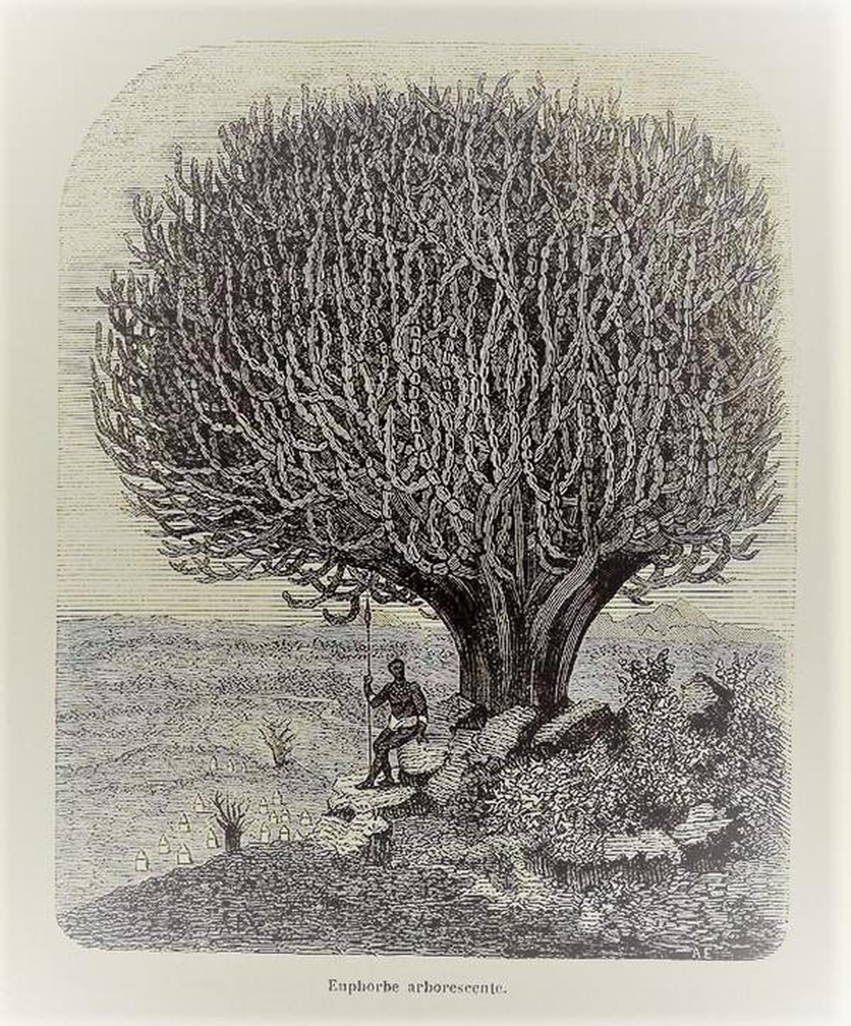 EuphorbiaceaeTras navegar el Océano Índico, la expedición ya comandada por Juan Sebastián Elcano se acerca a las costas sudafricanas con el objetivo de doblar el Cabo de Buena Esperanza y poner así rumbo de regreso a España. Pigafetta escribe en abril de 1522 en su diario que tuvieron que permanecer nueve semanas enfrente de este cabo. Lo hicieron a pesar de que sus fuerzas iban ya muy mermadas, por ser el de Buena Esperanza el más grande y peligroso cabo conocido de la Tierra.