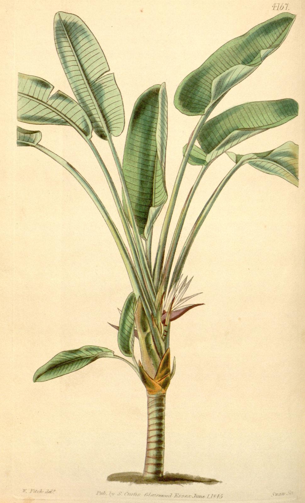 StrelitziaceaeEmparentado estrechamente con el género Musa, con las que muchas veces se confunden, las Strelitzia son plantas rizomatosas usadas habitualmente en jardinería, con una característica flor protegida por una espata carnosa abarquillada. La S. alba es la mayor del género, pudiendo alcanzar con su porte arbóreo hasta 10 m de altura. El epíteto alba alude al blanco de su flor.