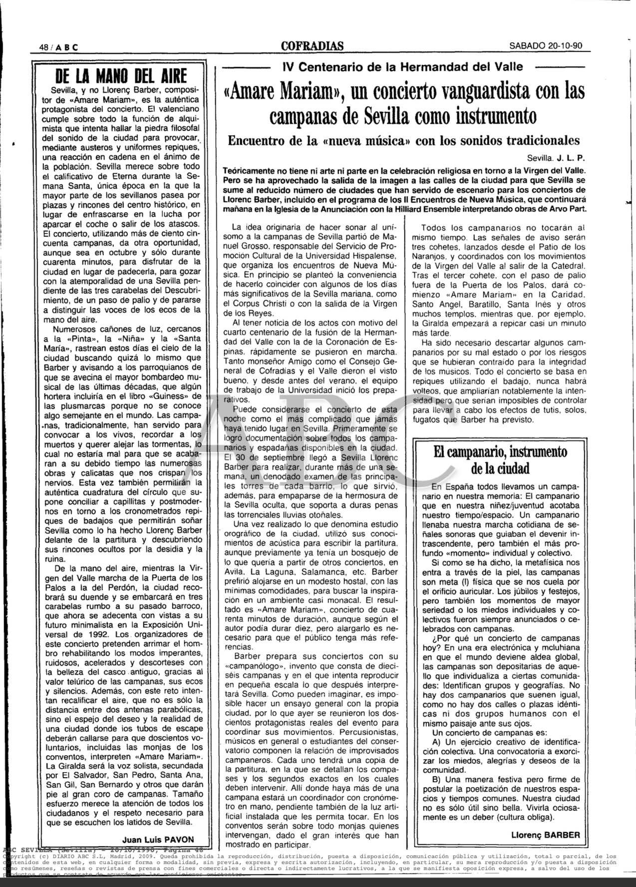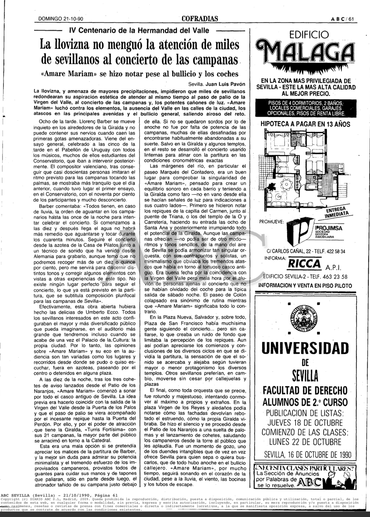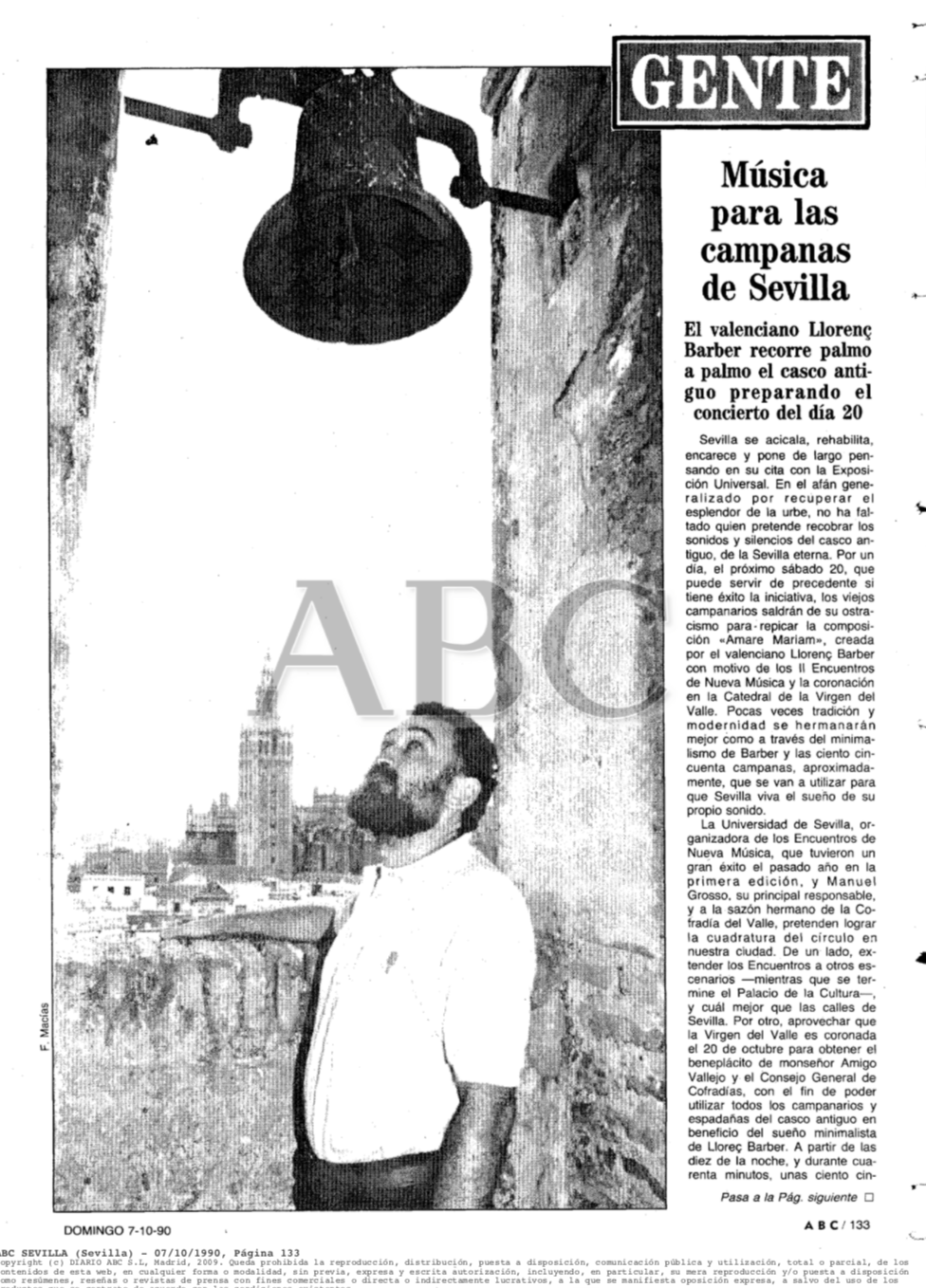 Una oportunidad para disfrutar en los jardines del antiguo convento de Santa Clara de una experiencia singular, diferente, irrepetible, como otras que ya nos ha brindado en Sevilla. Memorable fue su concierto en Pasaje Mallol, organizado por su sobrino Santi Barber; sus participaciones en los certámenes de música contemporánea; y sobre todo, su magnánimo concierto de campanas "Amare Maríam", hace ya casi 30 años.
