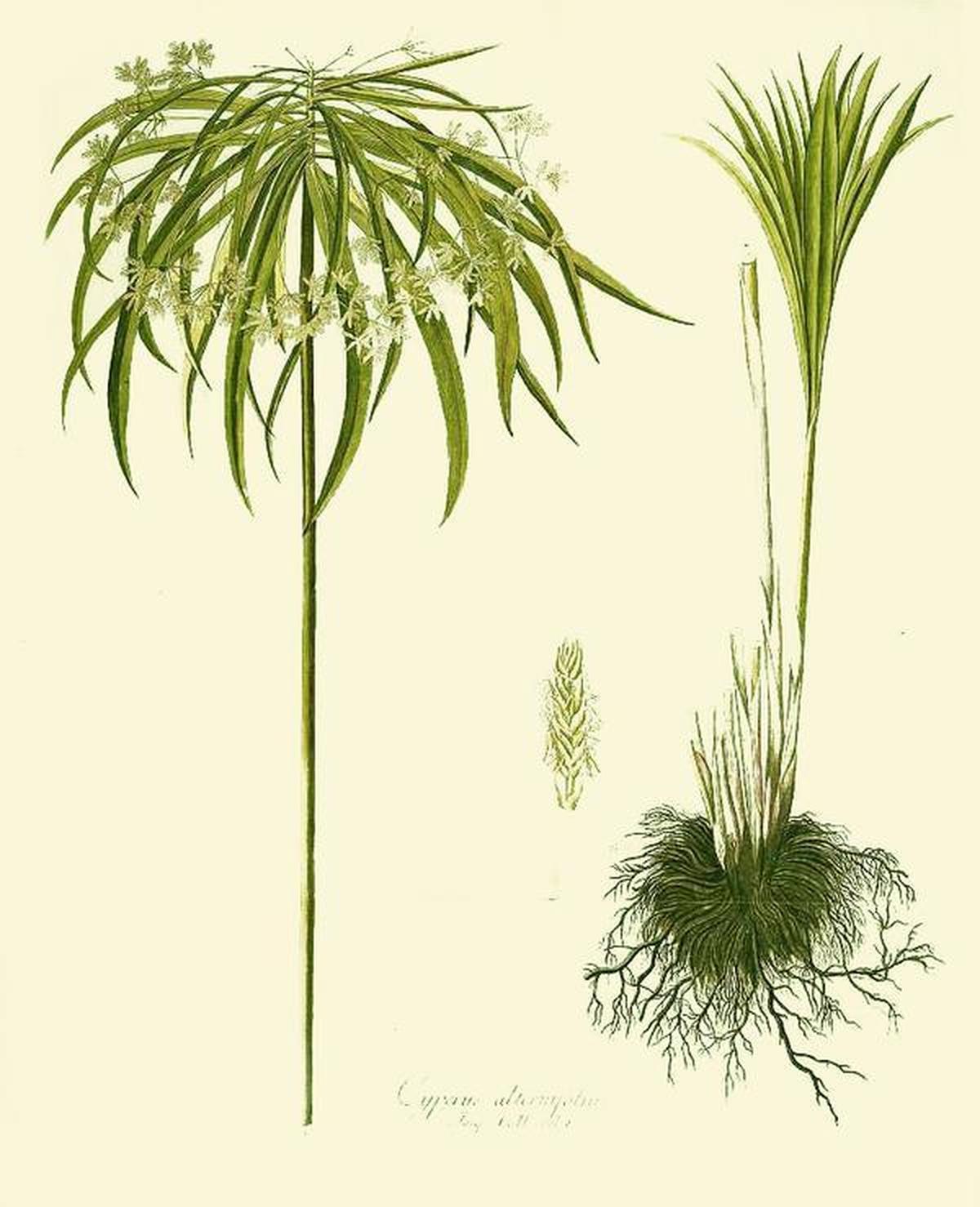 Su uso ornamental en los estanques y grutas de jardines históricos europeos parece explicarse con la moda orientalista y romántica que comienza en el siglo XIX y continúa en las primeras décadas del XX. En este momento, el gusto por las plantas exóticas que promovían las por entonces dos potencias coloniales del siglo -por un lado los ingleses con sus jardines botánicos y sus invernaderos y por otro la Francia de las exposiciones universales parisinas-, habían generado en la jardinería europea una tendencia a recrear de manera superficial espacios también exóticos, que recordaran a lugares lejanos, incluso a civilizaciones antiguas. En boga estaban así tipologías de jardines orientales como el islámico, el hindú, el de la China, pero también un nuevo e idealizado interés por la Antigüedad, no solo grecorromana. Así, el papiro, en su defecto plantas similares como el paragüitas, podían evocar un paisaje del Antiguo Egipto.Procedencia