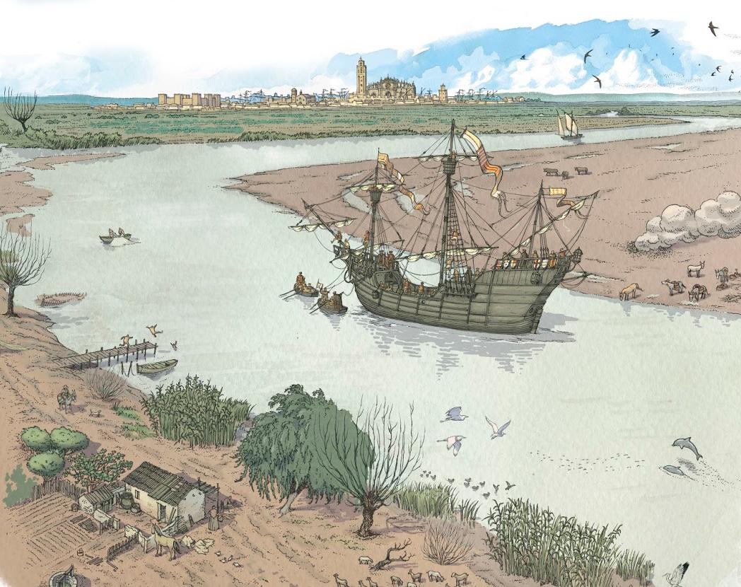 Aquellos días de verano, las naves descienden lentamente el curso del Guadalquivir, acompañados por la cinta verde de vegetación que crece en los márgenes del río. Los expedicionarios pueden ver, allí donde se respeta la tala y el ganado, las riberas cubiertas de arboleda: álamos, tarajes, olmos, fresnos, sauces... Esta vegetación se complementa, más al interior y conforme se avanza hacia el sur, con los pinos que, desde Utrera y hasta la desembocadura en Sanlúcar, sirvieron durante siglos como madera predilecta en la construcción de los mismos barcos que surcaron las aguas de esta autopista fluvial. El 6 de septiembre de 1522, Sanlúcar será el primer puerto del continente europeo al que llegue la única nao superviviente, la Victoria. Será a su vez el primer suelo que besen los 18 hombres que, con aspecto cadavérico, salieron dando tumbos de aquella embarcación que ya nadie por estas tierras recordaba. A la mañana siguiente, un remolcador arrastrará a la nao río arriba, hacia Sevilla: una vez circunnavegado el mundo, ya no tiene fuerzas la Victoria para luchar contra la corriente. Ilustraciones: Artefacto/ Arturo Redondo