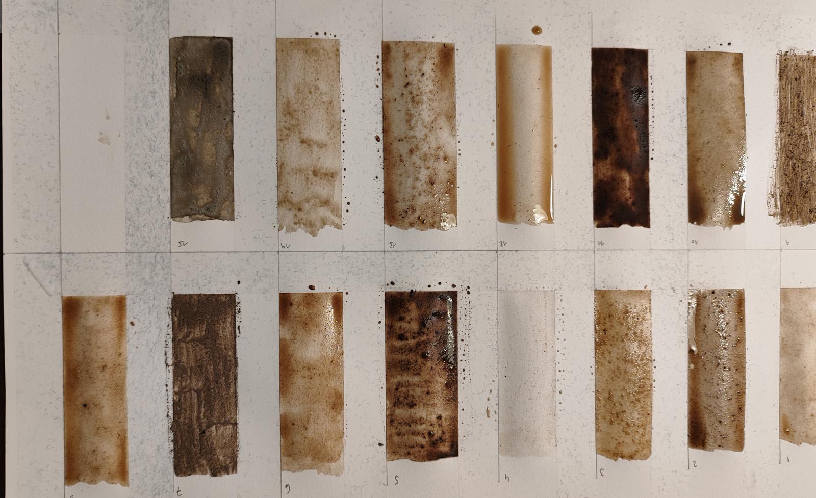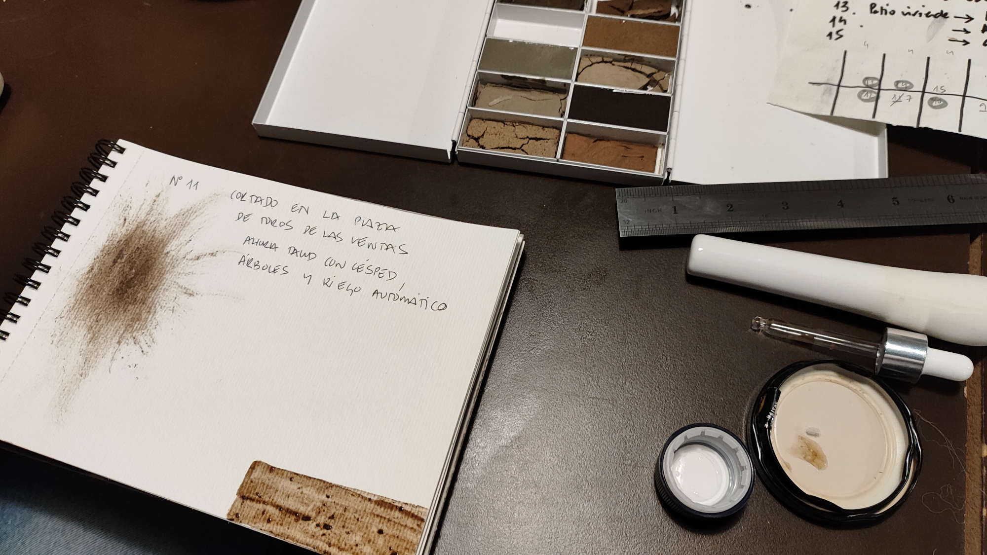 Fue un subidón ver cómo las muestras de suelo extraídas de alcorques, junturas de baldosas, taludes, parques, del antiguo cauce del arroyo abroñigal, tras ser molidos y decantados con agua, conformaban uan paleta de tonos que escondían la historia de sus antiguos usos, antes de que la urbanización los ocultase del paisaje de la ciudad.