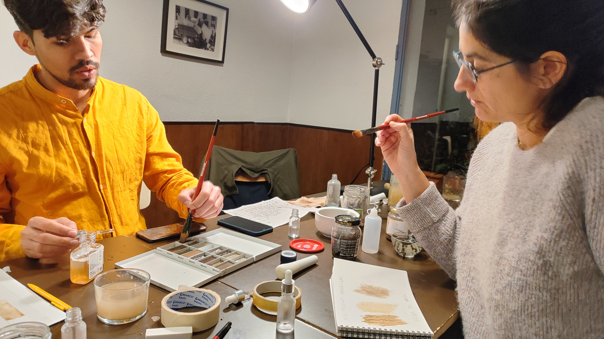 Una vez secos los pigmentos en nuestra paleta de colores, añadimos goma arábiga a cada casilla de la paleta para obtener una acuarela con más textura.