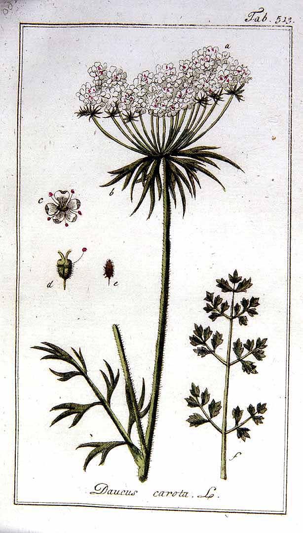 La zanahoria silvestre es muy abundante en los márgenes de caminos y campos de cultivo abandonados. Desarrolla una gran umbela blanca que forma frutos cubiertos por espinillas; la umbela se cierra en el momento de la fructificación.